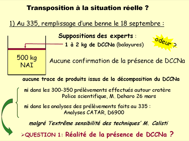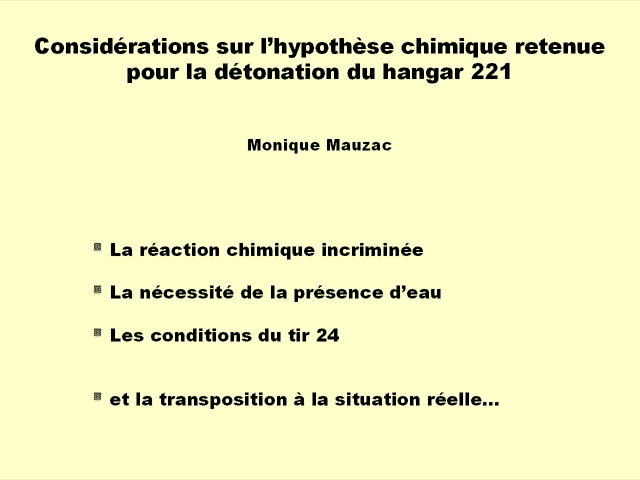d'AZF, le 21 Septembre 2001. Partie civile au procès, elle n'a, de cesse, depuis ce jour, fourni tous ses efforts pour contribuer à recherche de la vérité sur l'origine de l'explosion. Ses compétences en matière de chimie l'ont rapidement conduit à dénoncer les scénarii chimiques irréalistes proposés par les experts judiciaires au cours de l'instruction. Le procès AZF-Toulouse fut, pour elle, l'occasion de présenter un exposé technique simple et didactique, montrant l'incohérence et l'insuffisance du dernier scénario proposé par la justice. Il fut aussi l'occasion de réitérer sa demande auprès de la justice de réouverture de toutes les pistes de recherche scientifique, même celles abordant une hypothèse uniquement chimique, afin de vraiment s'orienter vers le chemin de la vérité. |